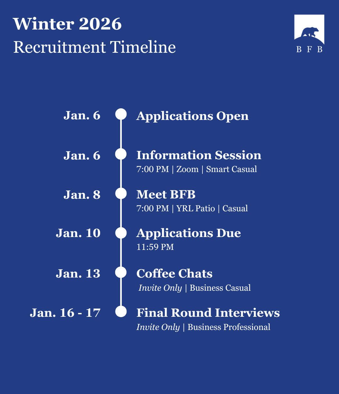Each fall and winter quarter, we recruit and develop top UCLA students with a strong interest in finance, banking, and related fields. We host an information session early on in these quarters to introduce our club and share insights into our recruitment process. Candidates then send in their applications, and selected applicants will continue through the interview process to become new BFB members.
